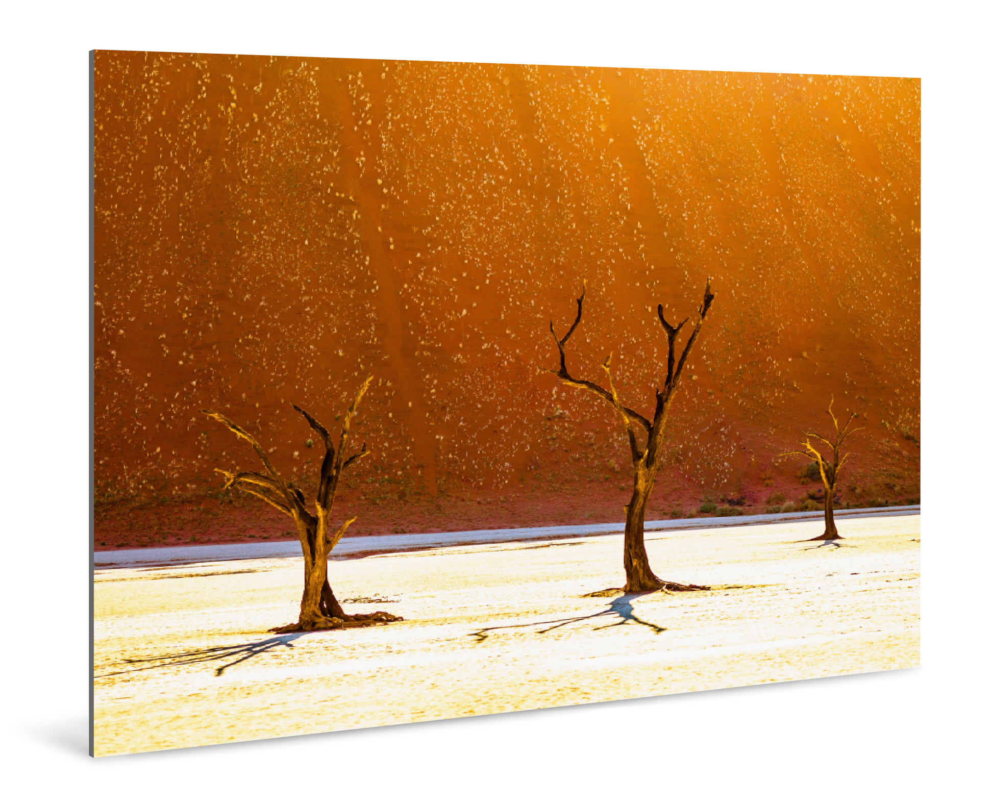 This ChromaLuxe Metal Print captures the essence of this surreal landscape. Three skeletal camel thorn trees, long since bleached by the sun, stand defiant against the unforgiving elements. Their twisted branches cast long, inky shadows across the pan, a testament to their enduring spirit.